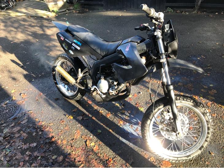 Jeg har denne derbi starter og køre mangler lidt instilling den står ikke så pænt og har lidt rust her og der men den køre godt og den køre stærkt efter min mening og starter i første hug den har 6 gear og der papir på den BYD os gerne