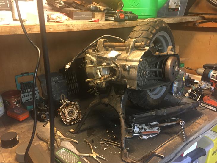 Her er jeg igang med at tag motor af, og tjekke det hele inden jeg sætter sports tun på. Gik igang med dremel idag på blokken, for den var godt nok ikke pæn. Cylinderen havde nogle krater, der hvor pakningen skal sætte. Som dem fik jeg fjernet med dremel. Tog ikke et minut og ordne. Så kom Aerox op og hænge. Var så dum at jeg kom til at sætte begge låseringe på, inden jeg fik den sat på krumtap, men var nok mit held. Fordi var ikke stage6 låseringe, de havde kun nogle skod nogle hjemme. Så jeg måtte fræse med dremel, før jeg kunne få dem af igen. Kickstarter skjold, startede med at slibe på det men blev meget mærkeligt efter. Så det endte med jeg tog malingfjerner, sådan nået gele. Som skal være på i 15 m og så kunne man lige tørre det af med papir. Men var da så dum, at jeg glemte handsker på først. Det er et værre svineri, men fik da næsten alt af. Så kan jeg få monteret cylinder og indsugning. startet med polyester spartel, pga stor lak i skjold. grundet bagefter og den fik 5-6 lag og vådsandpapir ind i mellem 2500.