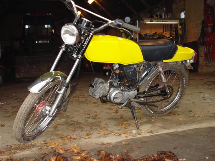 Det er et projekt ! den skal slibes ned og males, og have skiftet forskellige dele ud så den bliver pæn igen har lige skiftet motoren, da det var hurtigere end at skifte koblingen på den der sad på den. den kører super godt, og starter med det samme.