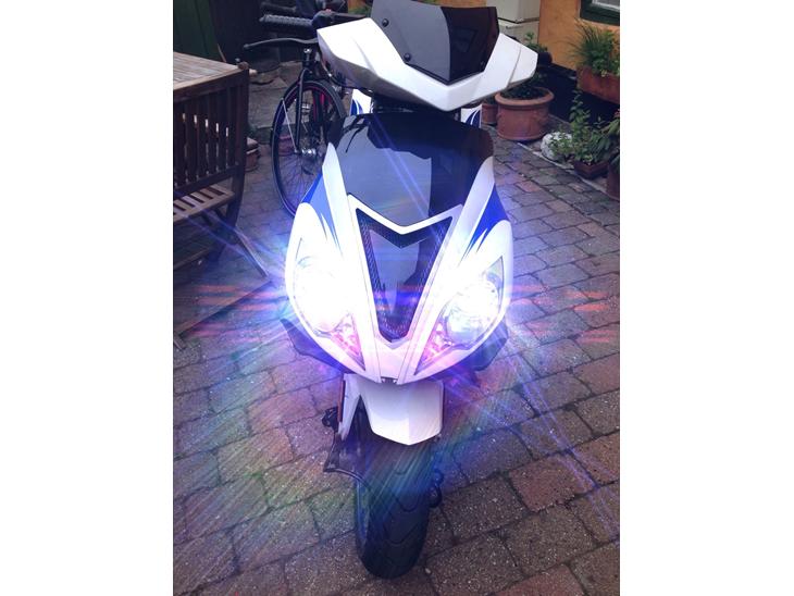 Næ ikke så meget at sige andet end den køre skide godt starter, hver gang let uanset temperatur, køre langt på literen og har en meget rolig 4 takts motorgang og størrelsen på scooteren er perfekt. Begrænsningerne er fjernet og den køre ca. 70