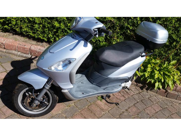 Piaggio Fly 4takt . Denne fine piaggio fly sælges i dele efter tyveriforsøg. (forsikringsskade) så selvfølgelig er der defekte låse. Den har nogle (meget) små skrammer flere steder - de fleste er brugsskrammer og der er ikke revner i skjoldene. Motor og hele scooteren har kørt godt 7000 km og motor starter og kører helt perfekt. Den sælges komplet, ( uden papire- forsikringsskade) eller i dele. Kun kontant